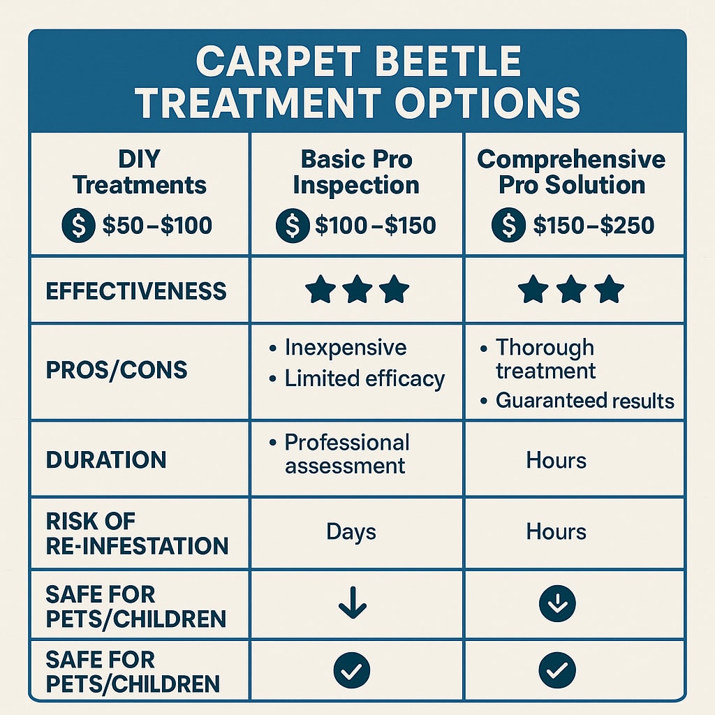 Bottom line: Whether you’re dealing with a brand new carpet beetle scare or a full-on issue, knowing these factors helps you plan, and ensures you get the right help (at the right price) for your peace of mind.