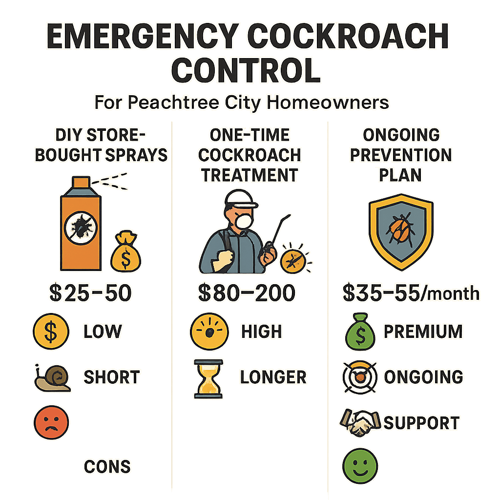 In Peachtree City, emergency cockroach treatments usually start around $80 for a basic, one-time service. Severe or widespread infestations can drive that cost up quickly, especially if follow-up treatments are needed. This is why getting ahead of the problem is not only better for your health but also for your wallet.