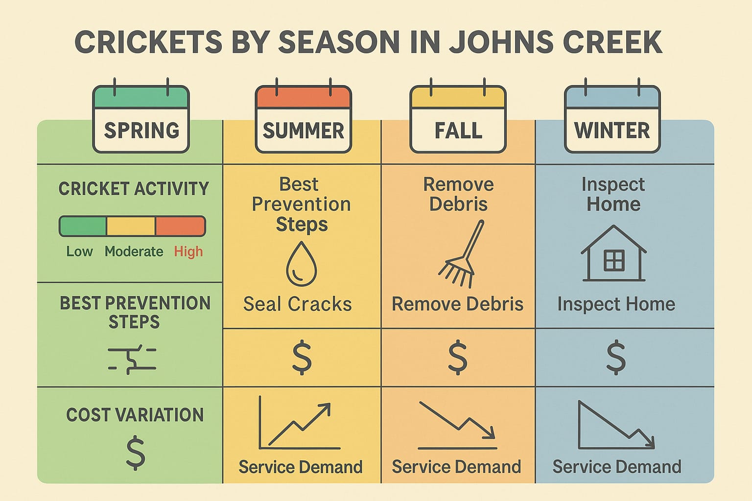 If you’ve ever been hit with a sudden cricket invasion, you know timing is everything. In Johns Creek, especially around neighborhoods like Sugar Mill and Seven Oaks, crickets really crank up from early spring through late summer. All that heat and humidity? It wakes them up, and after a heavy rain or a steamy Georgia night, it’s not unusual for homeowners to hear that nonstop chirping—or spot damage in the basement.