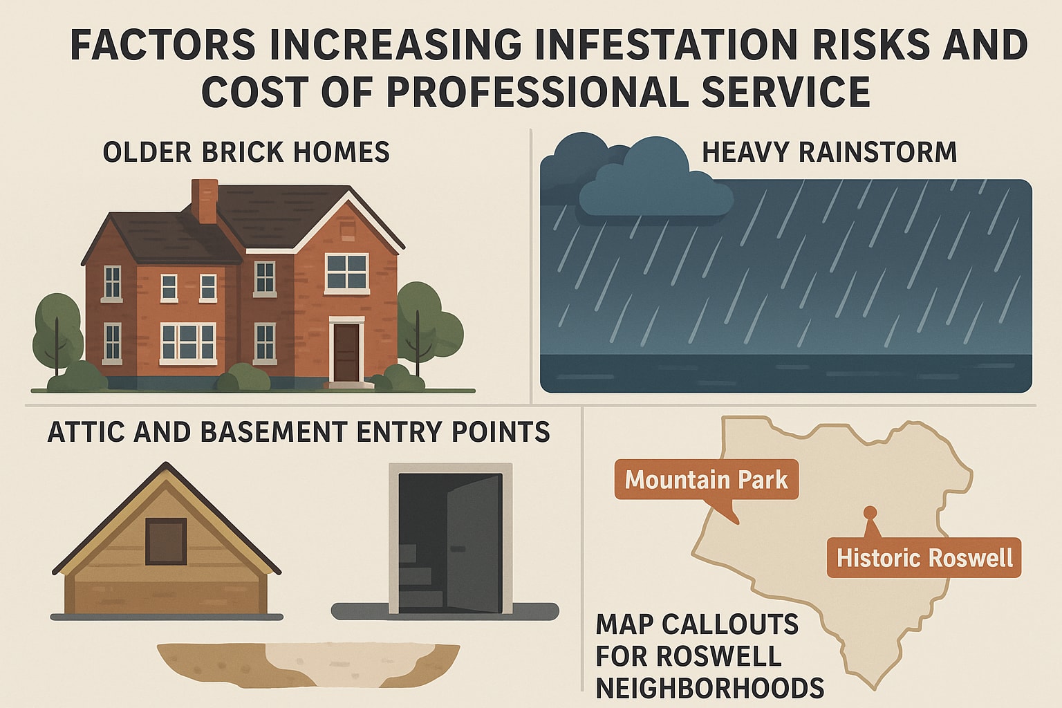 The methods used by your pest control pro influence the bottom line, too. Humane trapping is standard and included in most quotes, but if there’s a need for additional work—like sealing five different entry holes or rodent-proofing a tricky finished basement—that can add $100 to $300 to your bill. Historic homes and houses with tough-to-reach attics or crawlspaces are especially likely to need extra exclusion work, particularly in older neighborhoods of Roswell.
