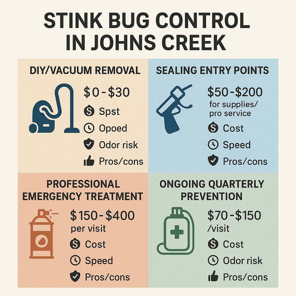 That’s why it pays to take action at the first sign of trouble. Whether you’re hearing tapping in the walls or spotting them sunning on the windows, it’s time to move. In the next section, we’ll break down all your emergency removal options—what works fast, what’s worth your money, and what you can do as a homeowner today, including expert tips on Stink Bug Control in Johns Creek. Curious about the costs and how each solution measures up? Stick around—we’ve got you covered.