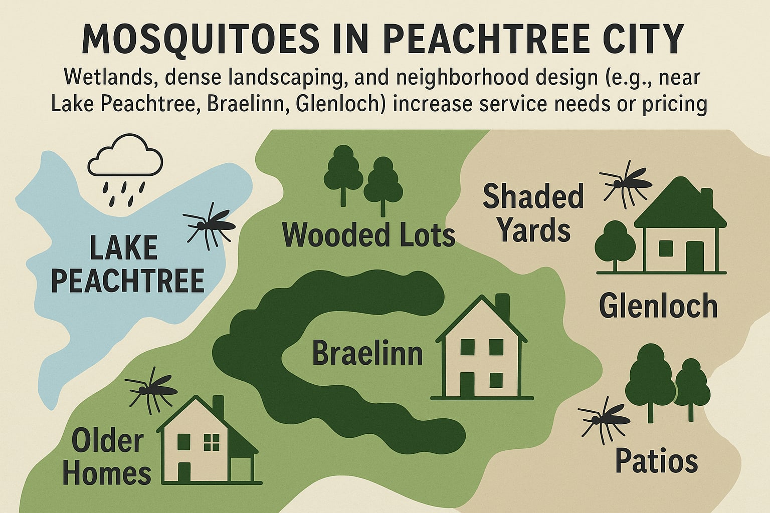 If you’ve lived in Peachtree City for a while, you know our summers get muggy, and our landscape is dotted with lakes, ponds, and winding green space. Those nearby water spots—like Lake Kedron or Pinewood Lake—don’t just look pretty, they create perfect hangouts for mosquitoes. Add in frequent summer storms, and suddenly you’ve got new batches of pests hatching almost overnight, especially in neighborhoods like Glenloch or Wilksmoor Village where the canopy is lush and standing water isn’t hard to find.