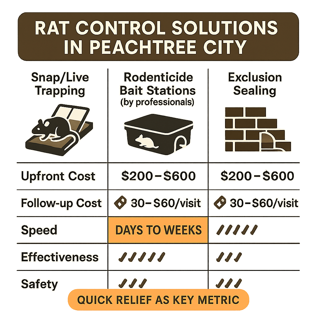 Luckily, local exterminators in Peachtree City know the drill. Fast-response rat removal services usually run between $200–$600 for an initial sweep (with inspection, traps, and sealing up entry points). Need follow-ups to make sure every last rodent is gone? Those usually clock in at $30–60 per visit—a small price to pay for peace of mind and a rat-free home.