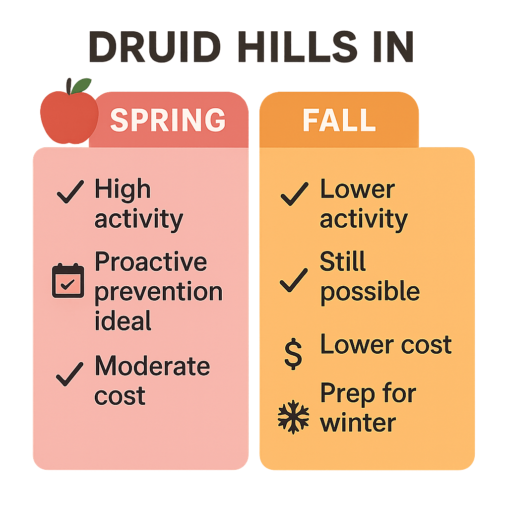 Bottom line: in Druid Hills, a little planning goes a long way. Waiting until you’re battling a full-blown swarm can increase the fruit fly control cost Druid Hills homeowners face and take longer to fix. Check out our seasonal cost and effectiveness graphic to see when to book for the best results, and reach out early to keep your home fruit-fly free, all season long.