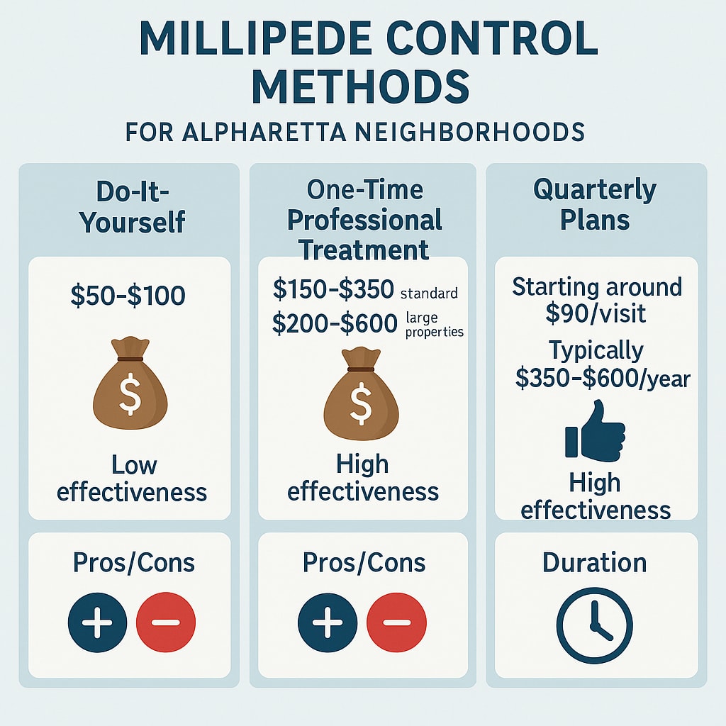 Some folks want a one-off service or think they’ll handle it with a DIY spray. That’s understandable, and usually, those are less expensive right out of the gate. But if you want reliable, long-term control—especially with the unpredictable weather and moisture we have here in Alpharetta—bimonthly or quarterly professional service covers you best. Most plans include perks like free re-treatments if the millipedes refuse to leave. These plan options do cost more over time, but you get peace of mind with that guarantee.