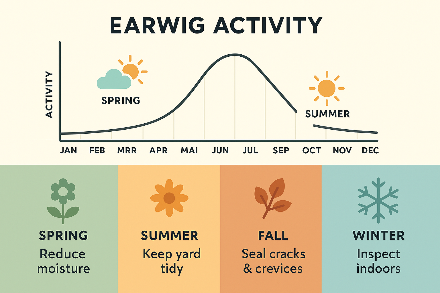 Understanding when earwigs are most active helps you time inspections and treatments. The chart below outlines typical activity levels in Suwanee, GA: