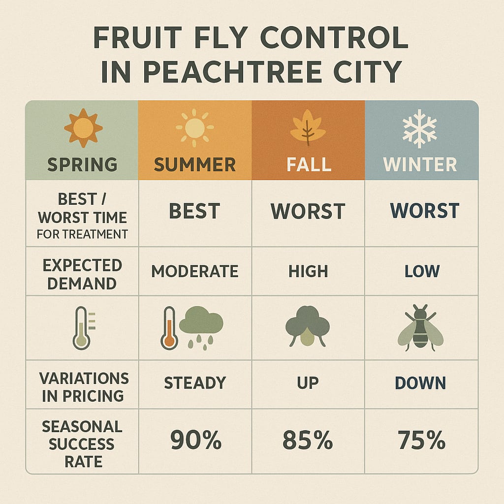 Stick with these steps and you’ll enjoy a fly-free zone all season. Ready for more? Check out our next visual guide on how each season affects fruit fly risks in Peachtree City and see how to time your efforts for the best results.